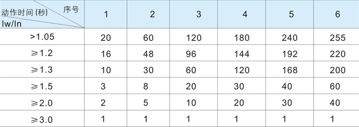 過流反時限故障延時動作時間表: