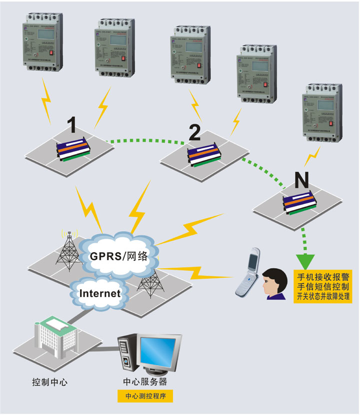 針對這一現(xiàn)狀,我公司研制開發(fā)了XM3L型剩余電流動作斷路器遠(yuǎn)程管理系統(tǒng)XMTZ1型智能通訊終端,該系統(tǒng)是以微處理器為核心,應(yīng)用GSM移動通訊技術(shù),對電網(wǎng)中運行的剩余電流動作斷路器進(jìn)行有效的檢測和管理的智能設(shè)備。通訊終端與各剩余電流動作斷路器實時監(jiān)控,進(jìn)行分析處理,在剩余電流動作斷路器故障跳閘時通過短信的方式通知管理者。終端還具有LCD顯示、自動檢測、故障告警、遠(yuǎn)程控制等通訊功能。