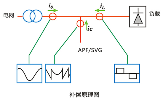 XMPQ通過(guò)外部互感器CT,實(shí)時(shí)檢測(cè)電網(wǎng)電流或者負(fù)載電流,控制器通過(guò)快速傅里葉變換提取出負(fù)載的基波電流、各次諧波電流,通過(guò)DQ旋轉(zhuǎn)坐標(biāo)得到有功、無(wú)功、負(fù)序等數(shù)據(jù),然后通過(guò)IGBT功率變換器產(chǎn)生與補(bǔ)償目標(biāo)(諧波、無(wú)功、不平衡)大小相等相位相反的補(bǔ)償電流注入電網(wǎng),實(shí)現(xiàn)對(duì)電網(wǎng)側(cè)的電能質(zhì)量改善功能。