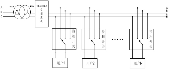 三相負(fù)荷不平衡自動調(diào)節(jié)裝置系統(tǒng),由一臺主機及多臺分機(15~20臺)組成,應(yīng)用于配電變壓器低壓側(cè)(220/380V),主機及數(shù)據(jù)采集裝置安裝于配電變壓器低壓側(cè),各分機分別安裝于終端用戶表前側(cè),通過無線通訊方式組成調(diào)控網(wǎng)絡(luò),系統(tǒng)主機采集配變各相負(fù)荷實時參數(shù),經(jīng)計算后以無線通訊方式控制各分機,各分機采用專用換相開關(guān)組件,將所接入的用戶負(fù)荷實時切換到合適的相別上,使配變低壓側(cè)負(fù)荷基本保持在平衡狀態(tài),從而達到減少線路損耗、變壓器損耗和延長變壓器使用壽命,提高供電質(zhì)量的目的。