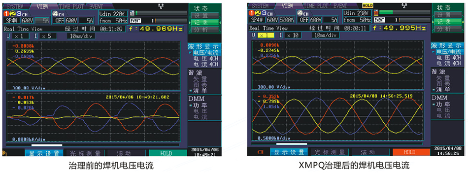 加裝XMPQAPF后,對電流諧波以及無功進行治理,效果對比如下,三相電流不平衡基本消失,中線電流基本為零,電壓電流諧波基本消失,THDi降低到2.7%,功率因數(shù)提高到0.980。